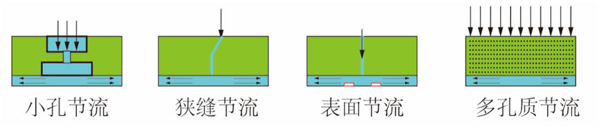 為了確保氣體靜壓軸承獲得較好的特性,要求承載間隙較小,通常間隙值為5~20 μm,當承載間隙改變時,軸承的氣膜壓力分布與承載力也會隨之改變。考慮到微塵顆粒尺寸與承載間隙尺寸相近,氣體源要經(jīng)過嚴格過濾才能進入軸承間隙。氣體靜壓軸承設(shè)計中節(jié)流器設(shè)計是其重要的設(shè)計部分,直接影響軸承的性能。根據(jù)氣體靜壓軸承的節(jié)流形式(如圖2)可將其分為小孔節(jié)流氣體靜壓軸承、表面節(jié)流氣體靜壓軸承、狹縫節(jié)流氣體靜壓軸承和多孔質(zhì)節(jié)流氣體靜壓軸承等。